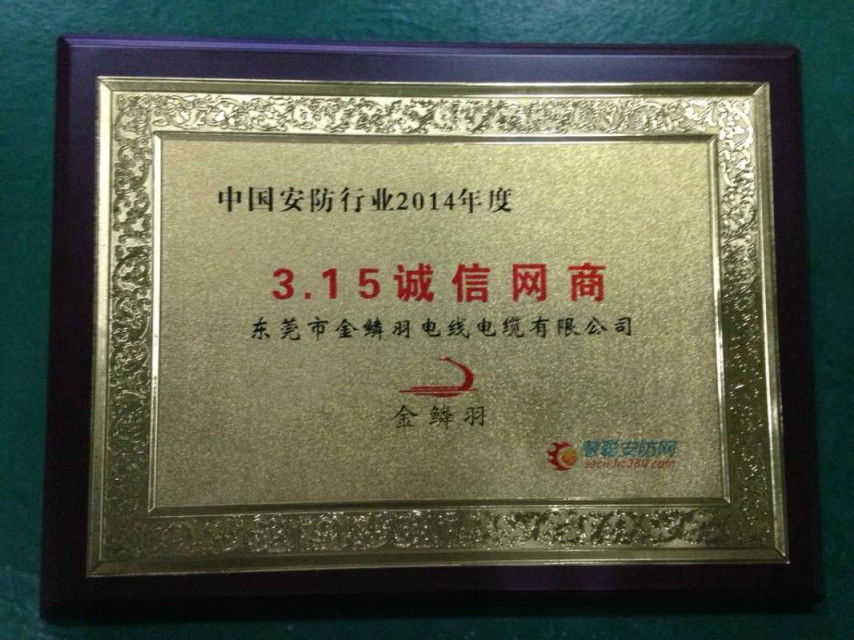 東莞市金鱗羽電線電纜有限公司榮獲2014年3.15誠信網商