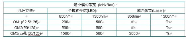 多模光纖(Multi Mode Fiber) - 芯較粗(50或62.5μm),可傳多種模式的光。但其模間色散較大,這就限制了傳輸數字信號的頻率,而且隨距離的增加會更加嚴重。因此,多模光纖傳輸的距離就比較近,一般只有幾公里。如下表,為多模光纜的帶寬的比較: