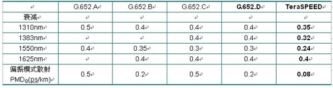 同時,由于G.652.D 是單模光纖的最新的指標,是所有G.652級別中指標最嚴格的并且完全向下兼容的。如果,僅指明G.652意味著 G.652.A 的性能規范,這一點應特別注意。TeraSPEED 光纖超過所有的指標均滿足 G.652.A, .B, .C和.D 的性能規范,如下表: