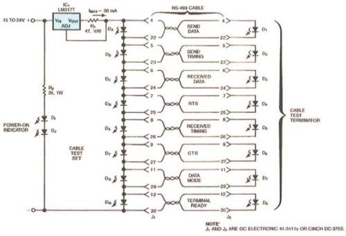 測試件采用電池供電,或15V~24V的直流電源。穩壓器(IC1)接成一個電流調節器,為電纜各端的LED串提供標稱25mA電流。本例中的電纜包含八個雙絞線對,如果電纜良好,則測試件上的全部八只LED(DA~DH是一個條形顯示器串聯的各段)以及終端件上的全部八只LED(D1~D8)都發光。如果某個雙絞線對開路或反接,終端件上的相應LED熄滅;如果某對短路,則兩端上的相應LED都熄滅;如果任何兩個不同線對中的無關導線短路,則兩端串聯的所有中間LED都熄滅。例如,若第4、6線短路,則LED DA、DB、D1和D2將熄滅。