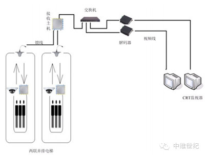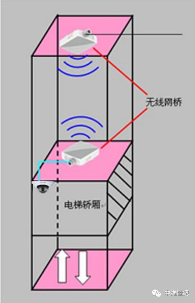 網線的最遠傳輸距離為100米,如果樓層較高,也可采用無線傳輸方式,無線網橋發送端固定在轎廂頂部,無線網橋接收端固定在電梯井的頂部,攝像機供電可直接采用轎廂頂部的AC220V電壓轉DC12V供電。使用無線網橋傳輸時應注意在設備調試過程中充分保證無線網橋的信號強度,確保視頻信號的流暢傳輸。