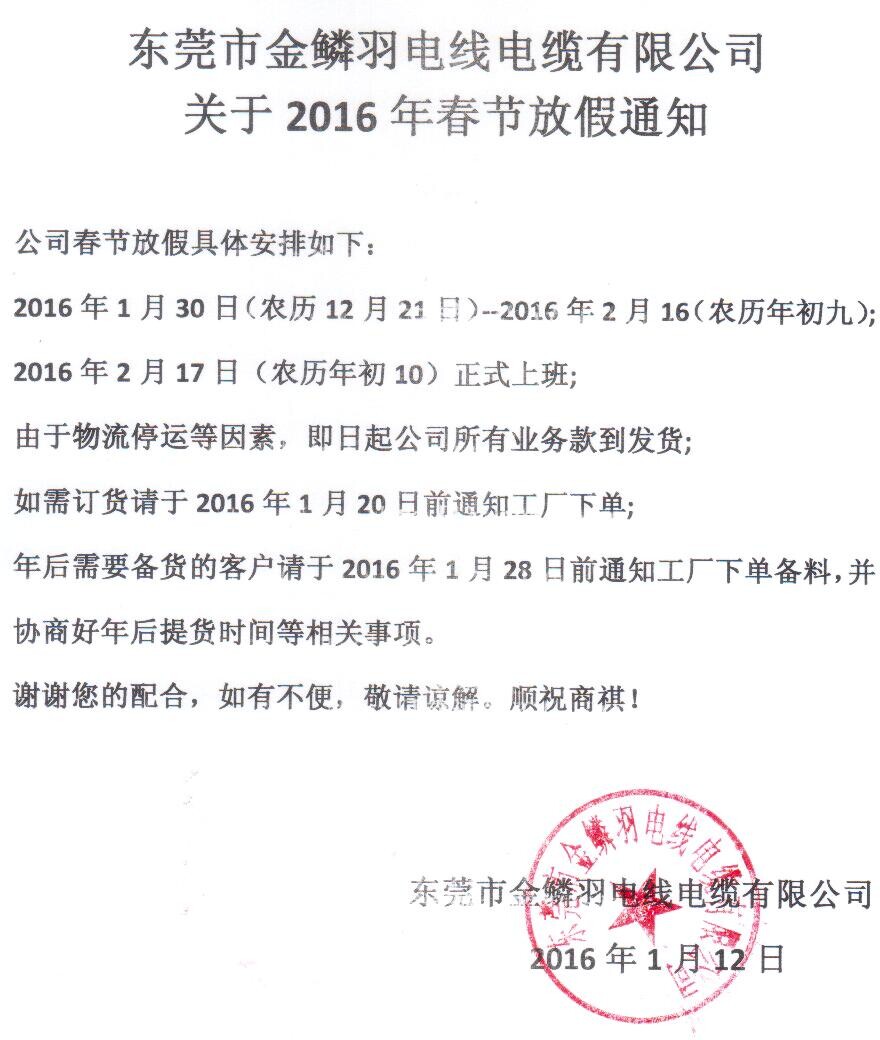 金鱗羽關于2016年春節放假通知