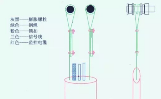 3.電梯轎廂一端的固定方法:由于不能在轎廂上采用膨脹鏍栓,所以就盡可能利用轎廂底部的園滑金屬橫梁來懸掛監控纜線的鋼繩;或者是在轎廂底部的垂直鋼板上鉆孔,用普通金屬鏍栓代替監控纜線的懸掛支點。