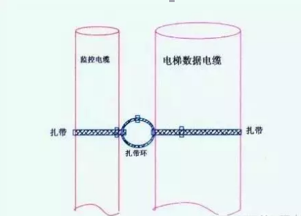 要點:用三根扎帶做成三連環扣的形式捆扎,兩個邊環分別捆扎在電梯數據電纜和電梯監控電纜上,中間的緩沖環直徑控制在1-1.5公分,數據電纜上的環扣略緊一點,以不跑位為準。監控電纜上的環扣宜松一點,以受力時能滑動為佳。示圖: