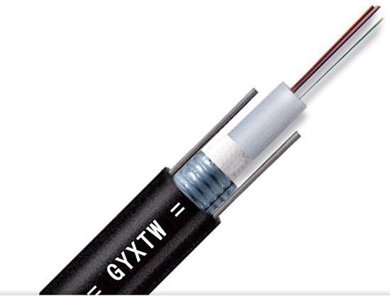 光纜的結(jié)構(gòu)是將單模或多模光纖套入由高模量的聚酯材料做成的松套管中,套管內(nèi)填充防水化合物。松套管外用一層雙面鍍鉻涂塑鋼帶縱包,鋼帶和松套管之間加阻水材料以保證光纜的緊湊和縱向阻水,兩側(cè)放置兩根平行鋼絲后擠制聚乙烯護(hù)套成纜。
