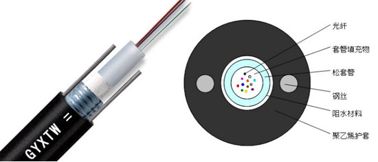 GYXTW光纜的結構是將單模或多模光纖套入由高模量的塑料做成的松套管中,套管內填充 阻水化合物。松套管外用雙面涂塑(皺紋)鋼帶縱包,鋼帶和松套管中間的阻水環保證了光纜的緊湊和縱向阻水,兩側放置的兩根平行鋼絲加強后護套成纜選用優質光纖,確保光纜具有優秀的傳輸性能。